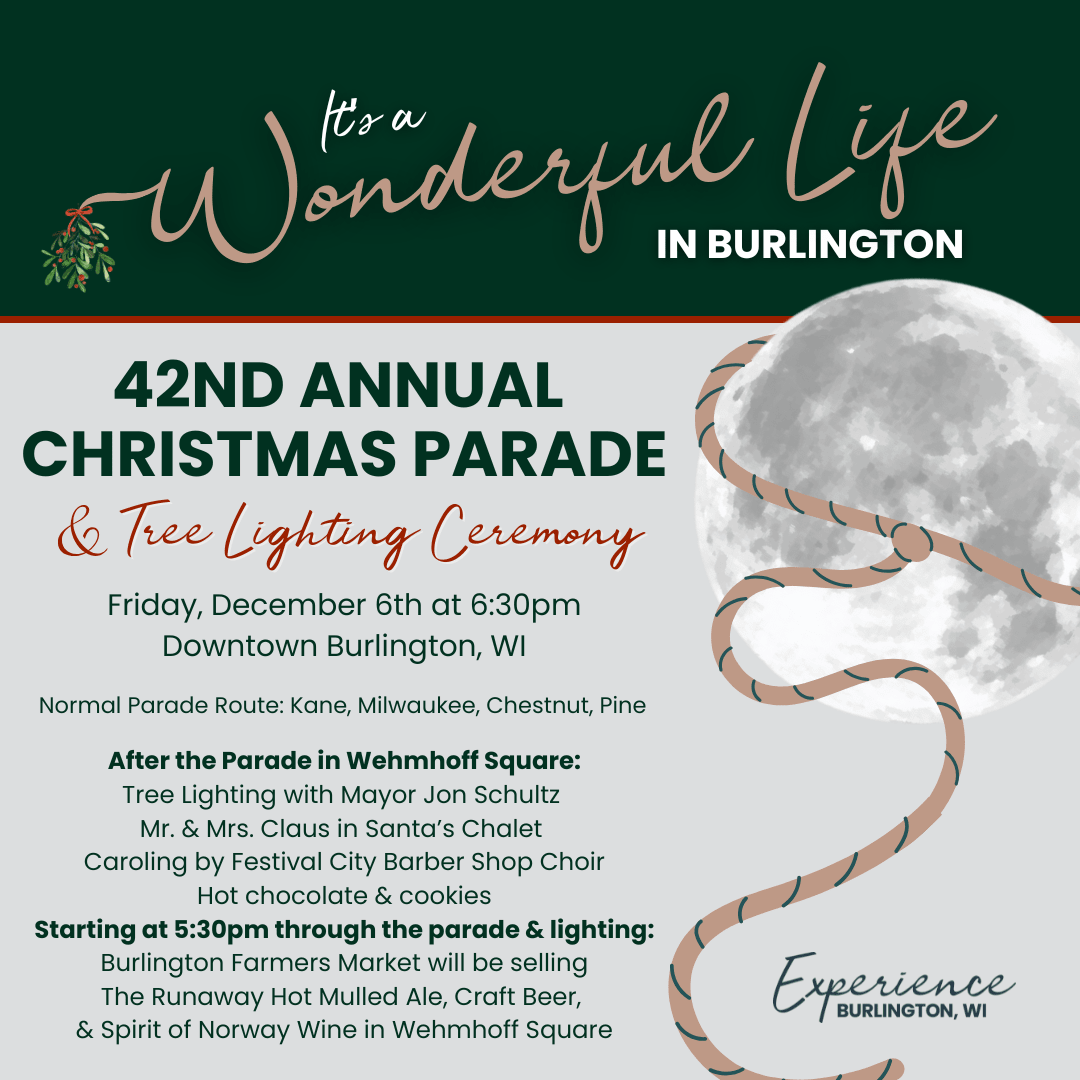 If you would like to participate in the parade, sponsor the Chalet or the parade, or volunteer that night, please register here or download the registration form. Deadline for parade participation is November 15th. Call Experience Burlington 262-763-6044 or email info@experienceburlingtonwi.org with any questions!