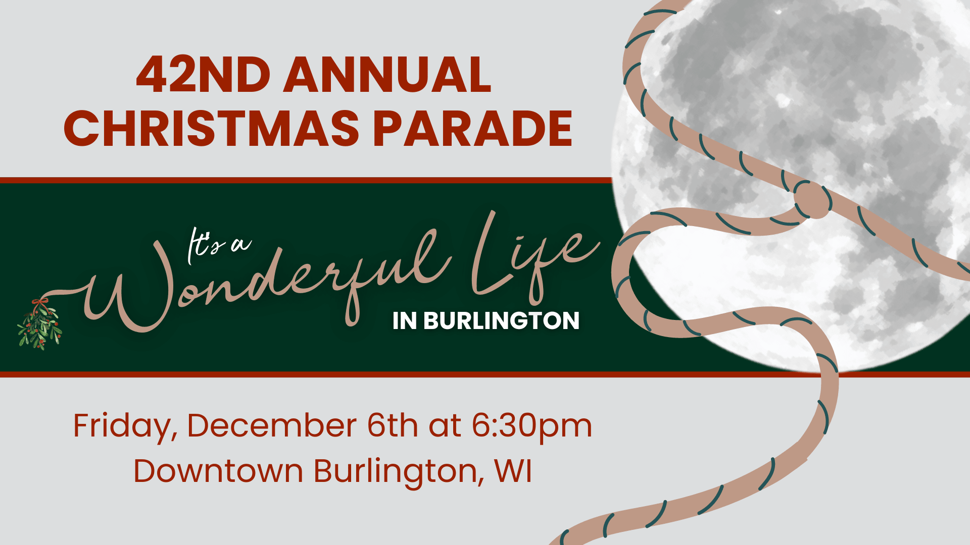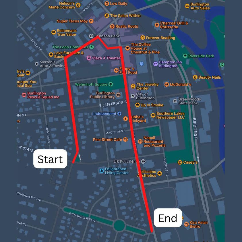 Join in the wonder of Christmas with Brrrlington's favorite holiday event: the annual parade! The parade will take place on Friday, December 6th at 6:30pm and the theme this year is It's a Wonderful Life in Burlington! Normal City parade route: Kane, Milwaukee, Chestnut, Pine (picture below)