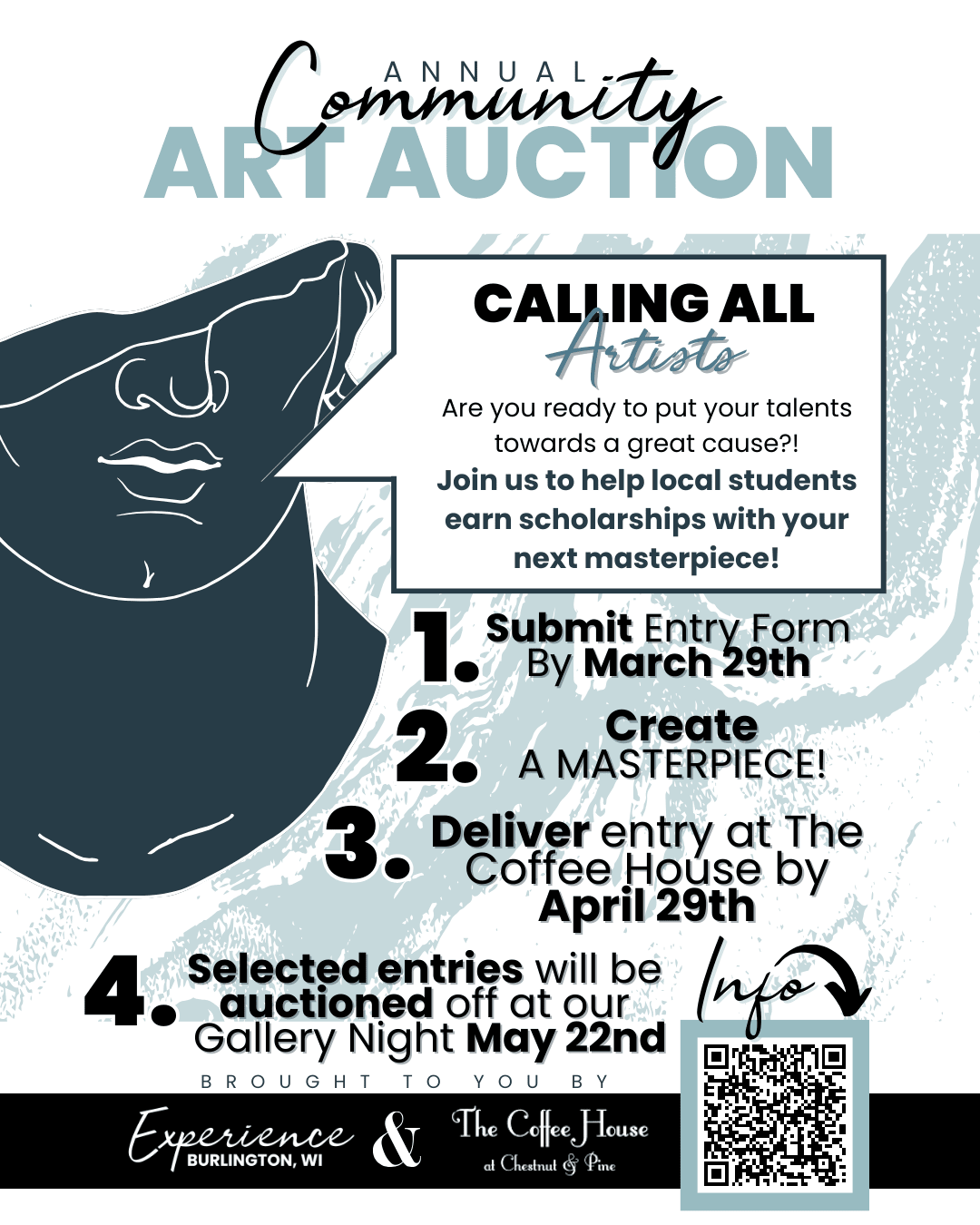 Experience Burlington & The Coffee House are partnering up for a Community Art Auction that will not only highlight the talented artists, but also help raise scholarship funds for 2024-2025 BASD & CCHS Graduates going into higher education, including 2-4 year trade programs!