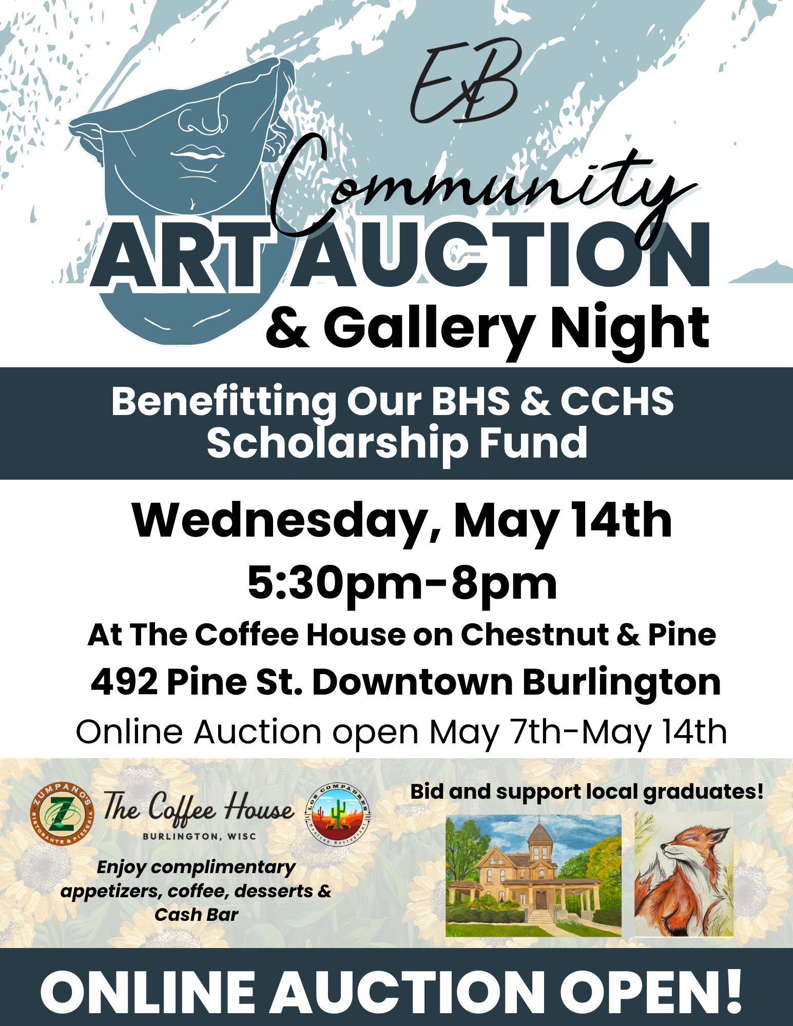 Experience Burlington & The Coffee House are partnering up for a Community Art Auction that will not only highlight the talented artists, but also help raise scholarship funds for 2024-2025 BASD & CCHS Graduates going into higher education, including 2-4 year trade programs!