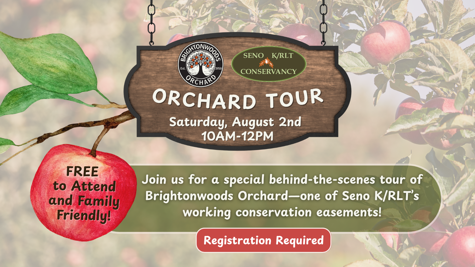 Tour one of Seno K/RLT Conservancy’s working conservation easements - Brightonwoods Orchard! Join Brightonwoods landowner Bill Stone for a tour of the orchard to learn all about apple history and the history of Brightonwoods Orchard itself and its protection via conservation easement, modern “designer” apples, what it really takes to grow apples, and what goes into processing apples for apple cider production. Get a taste of some of the early season apples, apple cider, and take a peek at other businesses onsite; Glas Spreadable Cheese and AeppelTreow Winery & Distillery! This is a family-friendly tour - families welcome!