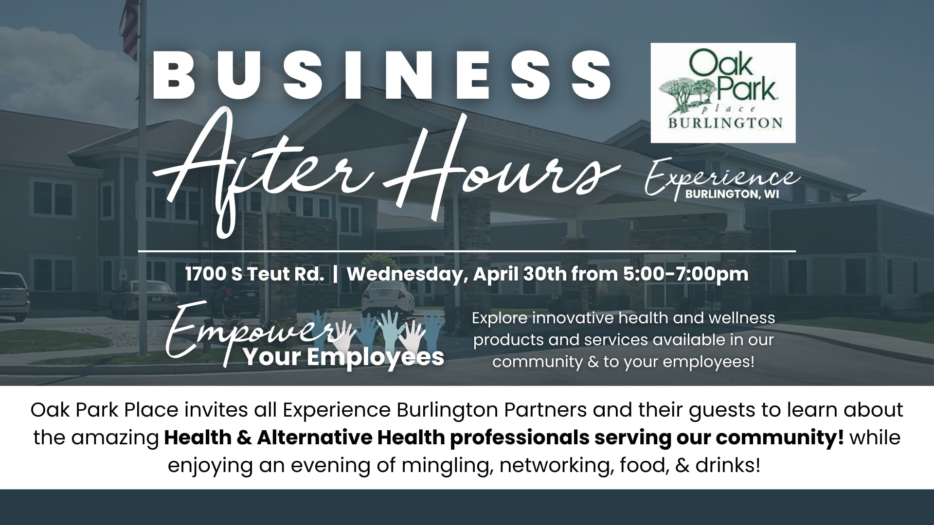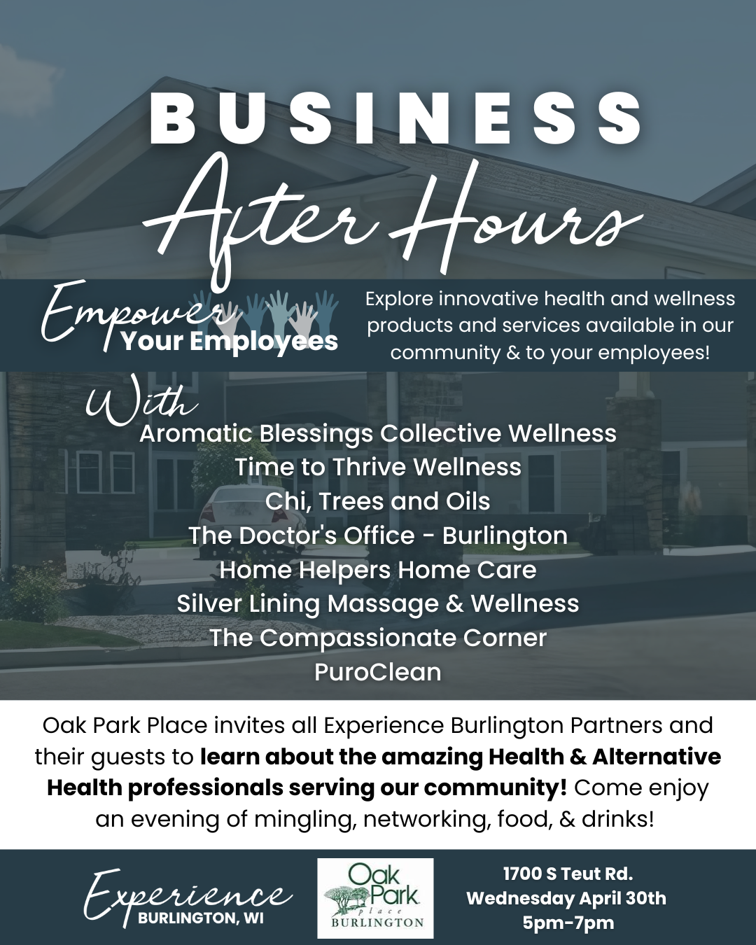 Oak Park Place invites all Experience Burlington Partners and their guests to learn about the amazing Health & Alternative Health professionals serving our community! Come enjoy an evening of mingling, networking, food, & drinks!