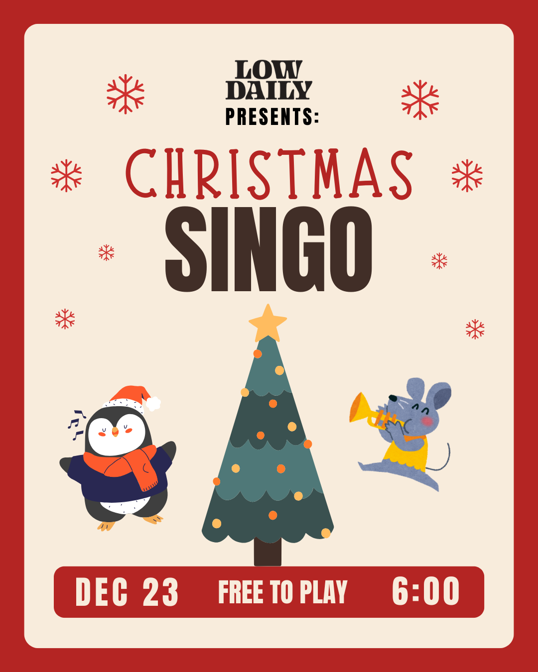 Instead of trivia this week, we will be playing Christmas SINGO! It’s like BINGO, but with Christmas music. You don’t actually have to know stuff, just listen, play along, and drink! Free to join, prizes for winners!
