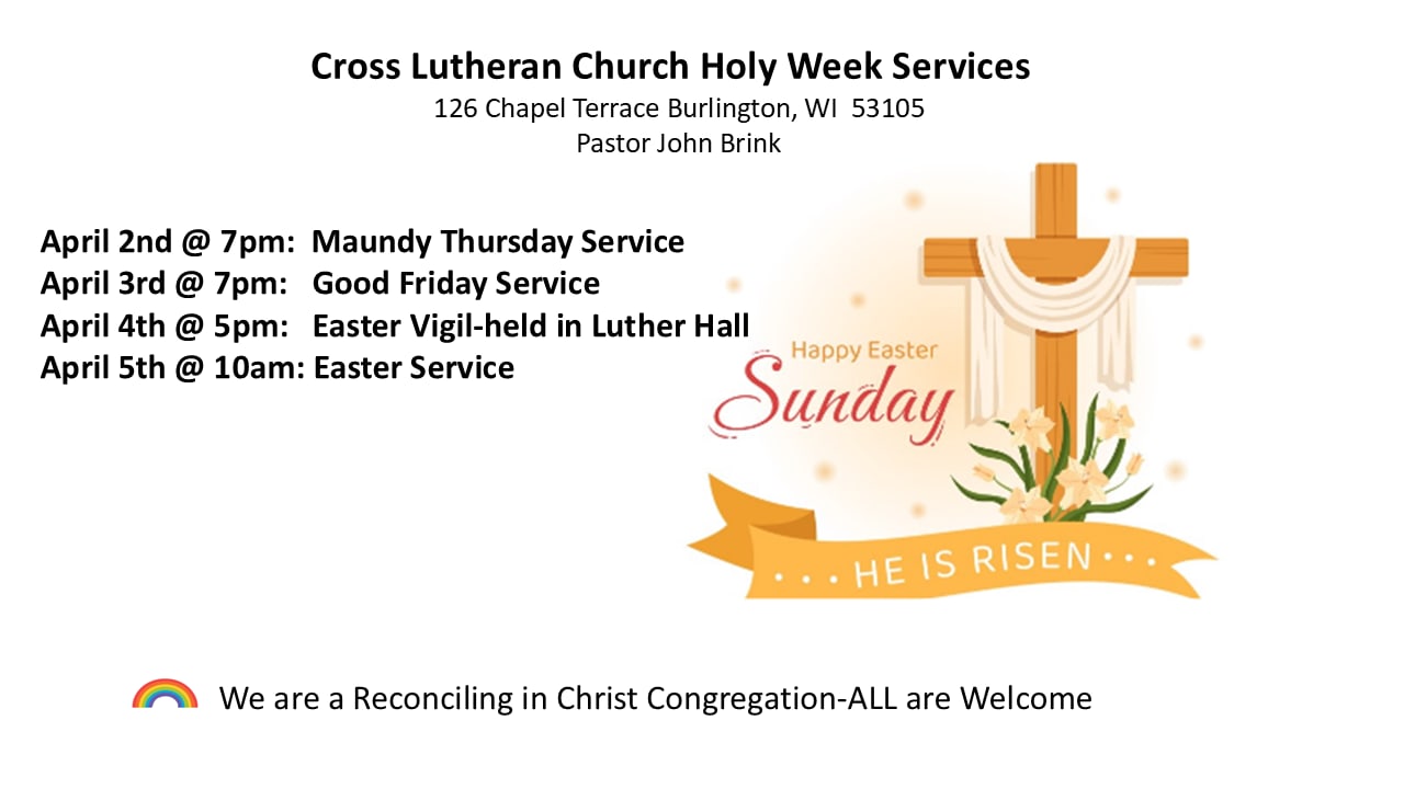 Join Cross Lutheran Church for Holy Week services. April 2nd @ 7pm: Maundy Thursday Service April 3rd @ 7pm: Good Friday Service April 4th @ 5pm: Easter Vigil-held in Luther Hall April 5th @ 10am: Easter Service We are a Reconciling in Christ Congregation-ALL are Welcome