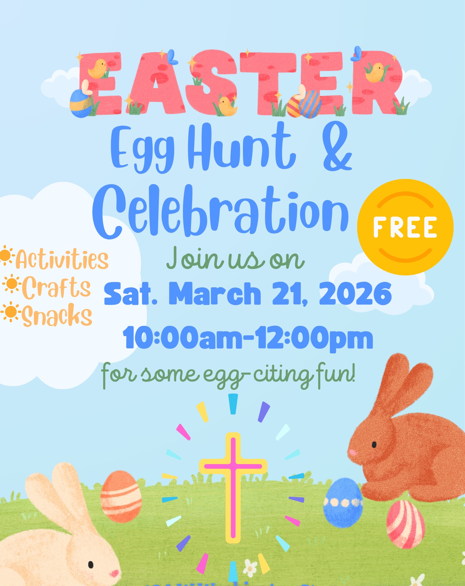 Join us on Saturday March 21st from 10:00am-Noon for a Free Egg Hunt, activities, crafts, and snacks!