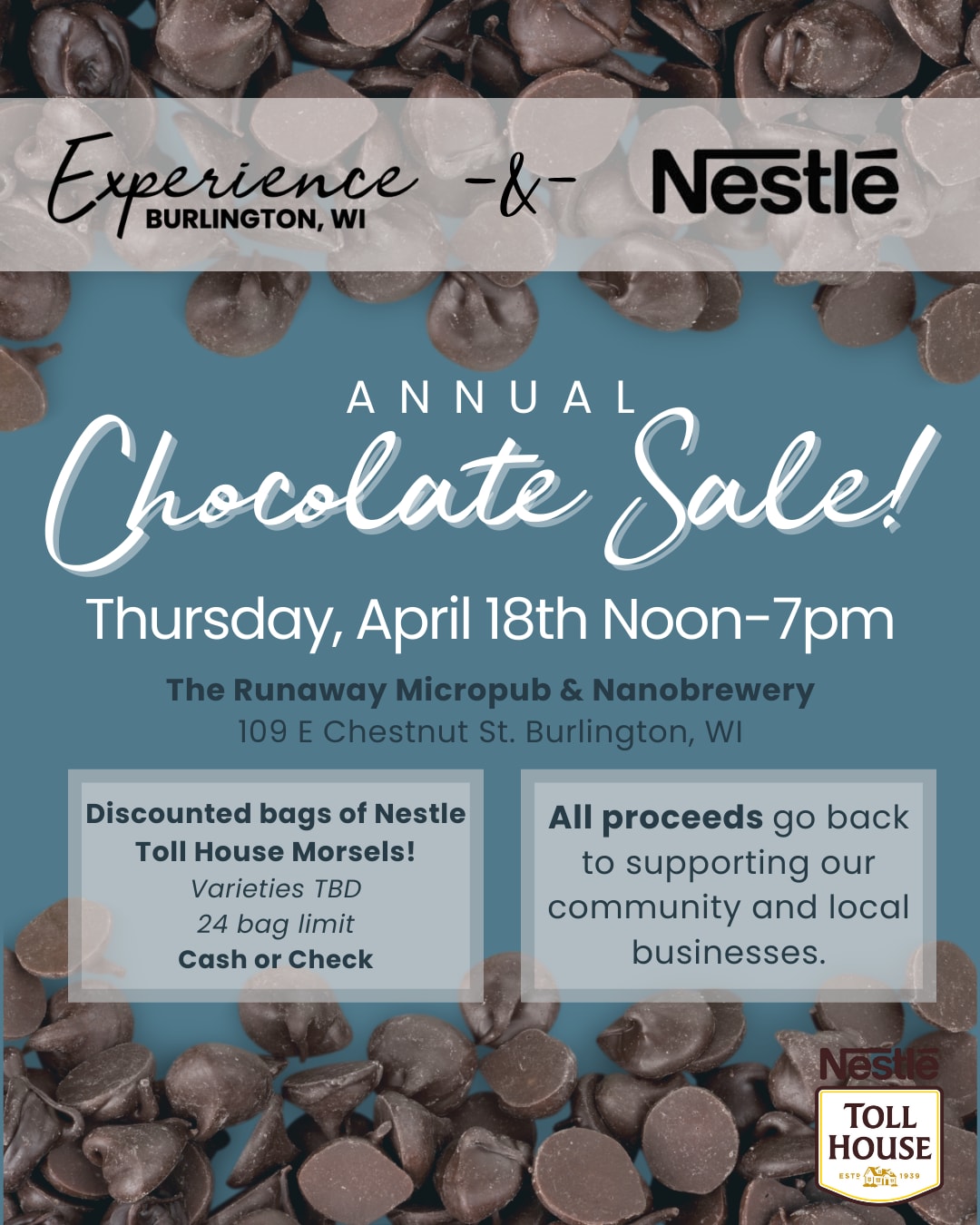 Join us April 18th at The Runaway Micropub & Nanobrewery for our Annual Chocolate Sale from Noon-7PM! All funds will go back to supporting our community and local businesses! Discounted Nestle Chocolate Chip Morsels - Varieties TBD 24 bag limit Cash or Check! Thank you to Nestle who partners with us each year to provide the chocolate!