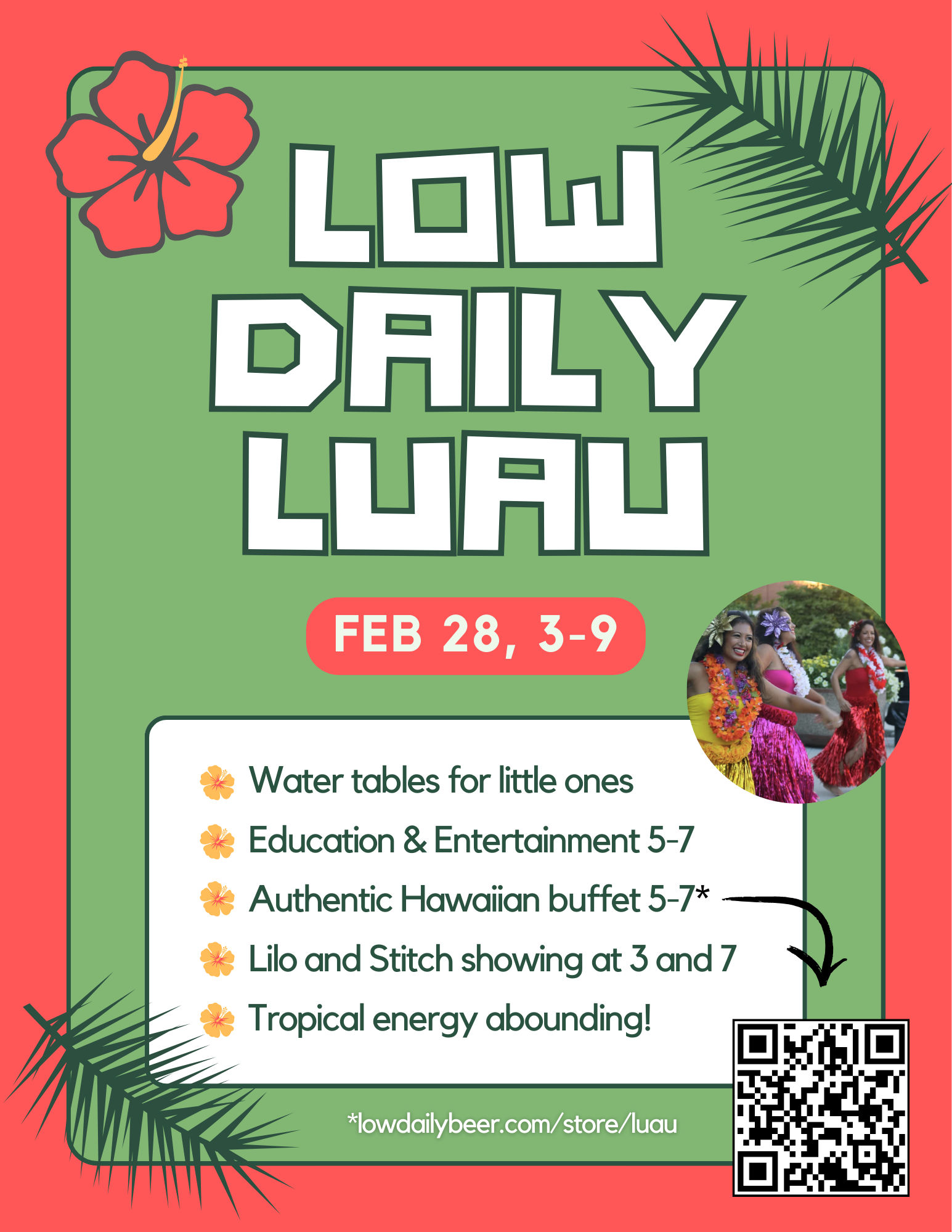 Bust out your Hawaiian shirts and bring the family down to Low Daily for a tropical evening that is sure to warm you up, even if it's cold outside! From 5-7 we'll have a Hawaiian education and entertainment program full of culture, music, and dancing for the whole family! We'll also have an authentic Hawaiian buffet by Ono Kine Grindz out of Milwaukee. Go to lowdailybeer.com/store/luau for tickets and get a complimentary pair of Low Daily sunglasses! Lilo and Stitch will be showing in the brewery at 3:00 and 7:00 and we'll have water tables out for the little ones. You're not gonna wanna miss this one! Mahalo!