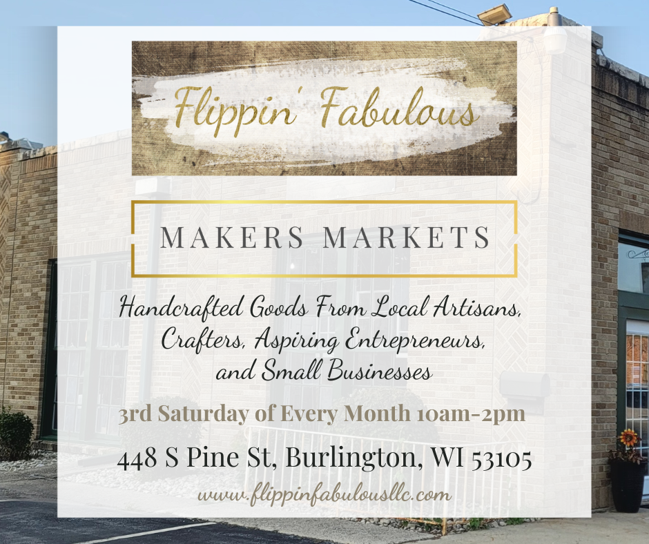 Flippin' Fabulous Makers Markets gives local artists, crafters, aspiring entrepreneurs, and small businesses a chance to showcase their unique, handmade goods to the community. They are held monthly on the third Saturday of each month from 10am-2pm. Markets are held indoors during the months of January-April, November, and December. Markets are held outdoors (rain or shine) during the months of May-October, and feature live music, food truck(s) and more. ~FREE admission ~Family friendly event ~Plenty of parking both on & off-street In addition to the temporary vendors at each market, we feature curated handmade goods from over 125 local artisans and small businesses within our store offering products such as home decor, upcycled & repurposed items, vintage, collectibles, apparel, accessories, gifts, and more. Make sure to check out all the amazing small businesses located in the historically charming downtown Burlington area along the beautiful Fox River. Come experience Burlington and see all that there is to offer. Hope to see you there! To inquire about becoming a vendor for the makers market events, please visit https://flippinfabulousllc.com/pages/makers-markets OR send an email to jessica@flippinfabulousllc.com To view more information or RSVP to this event, please visit: https://flippinfabulousllc.com/pages/current-events#?event-id=43668 To view a listing of other current events at Flippin' Fabulous, please visit: https://flippinfabulousllc.com/pages/current-events To see a listing of past events held at Flippin’ Fabulous, please visit: https://flippinfabulousllc.com/pages/past-events