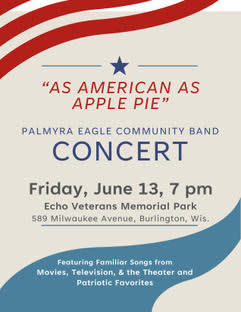 AS AMERICAN AS APPLE PIE! Free concert featuring familiar songs from movies, television, theater & patriotic favorites! Presented by the Palmyra Eagle Community Band