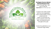 Burlington Farmers MarketWehmhoff Square ParkEvery Thursday 3pm-7pmMay 8–Sept 25(Night Market: 6/19, 7/17, 8/21: 3pm-8pm)A vibrant mid-week market with fruit and vegetables, meat, cheese bakery, honey, preserved andready-to-eat foods, live ...