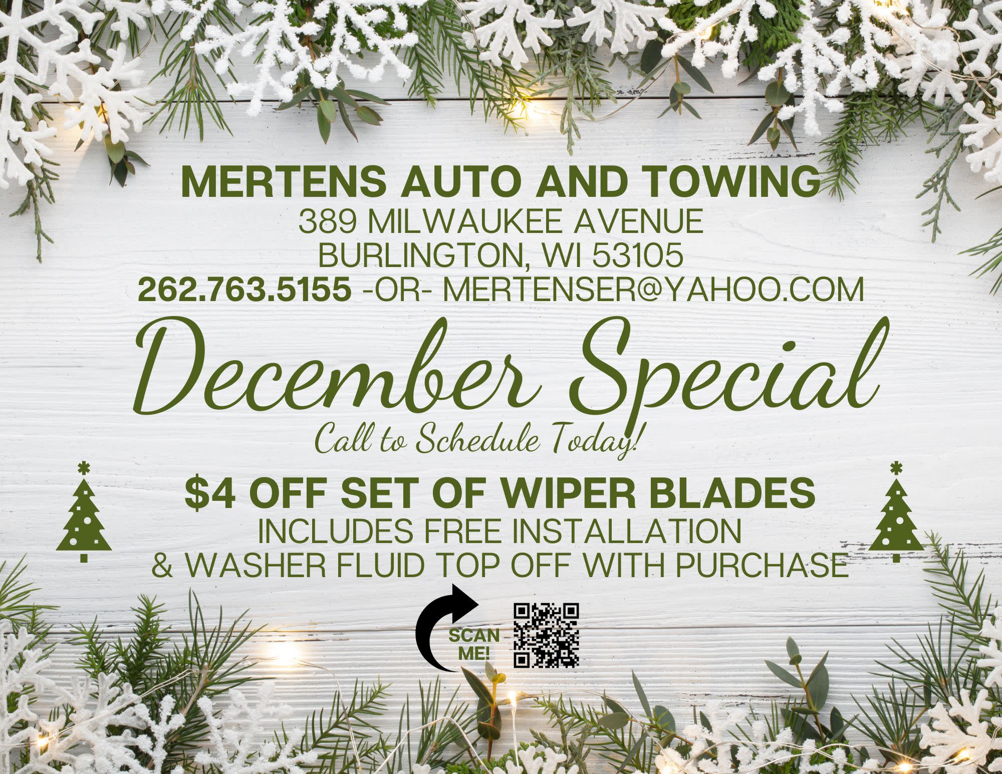 Mertens Auto December Special Back to Hot Deals Mertens Auto December Special By Merten's Auto & Towing Service 12/2/2025 Images Images × Share × Email Facebook LinkedIn X Pinterest Powered By GrowthZone
